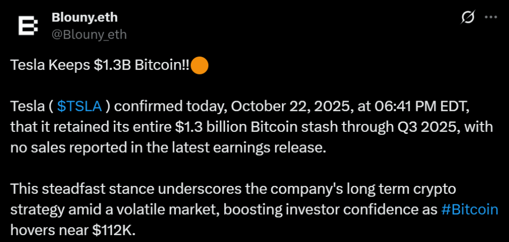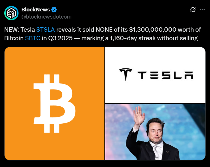 Tesla remains one of the largest corporate holders of Bitcoin globally, alongside firms like MicroStrategy and SharpLink Gaming. Its Q3 gain underscores how traditional companies with crypto exposure can see meaningful balance-sheet impacts when digital assets rally.