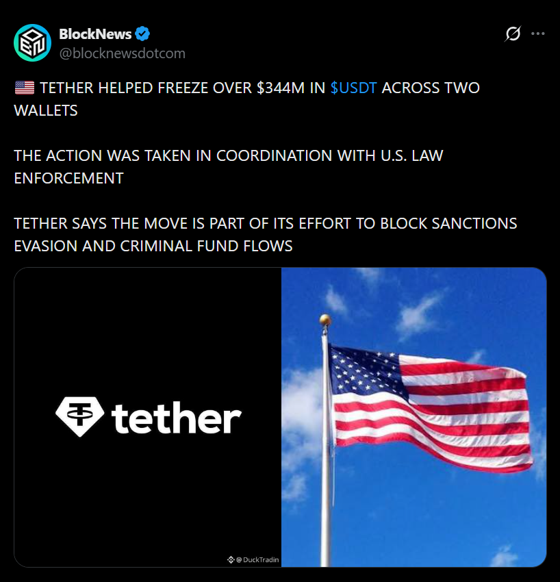 Tether has frozen more than $344 million worth of USDT, and this wasn’t a random move, it came directly from coordination with US regulators and law enforcement. The action targeted two wallet addresses linked to suspected criminal activity, locking the funds before they could be moved, which, in cases like this, is kind of the whole point.