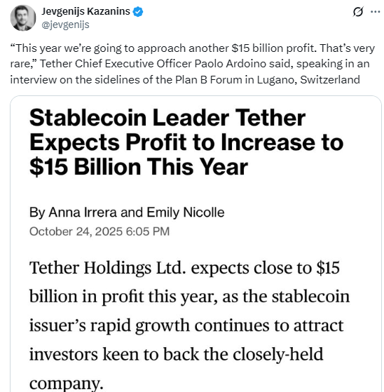 • Tether projects $15 billion in profit for 2025 as Treasury yields boost its stablecoin-backed reserves.