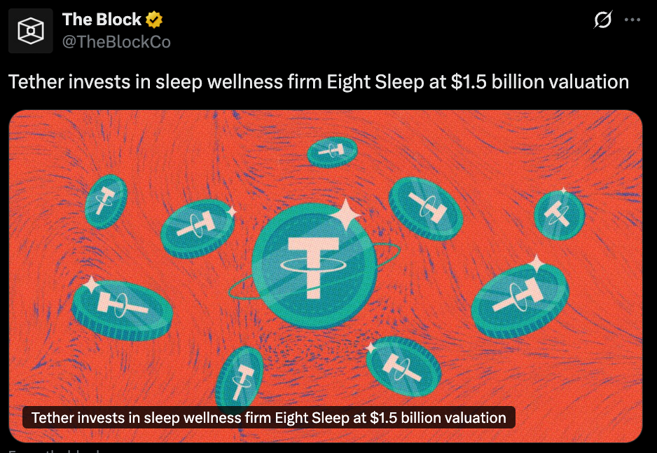 - Tether invested in sleep-tech firm Eight Sleep at a $1.5 billion valuation