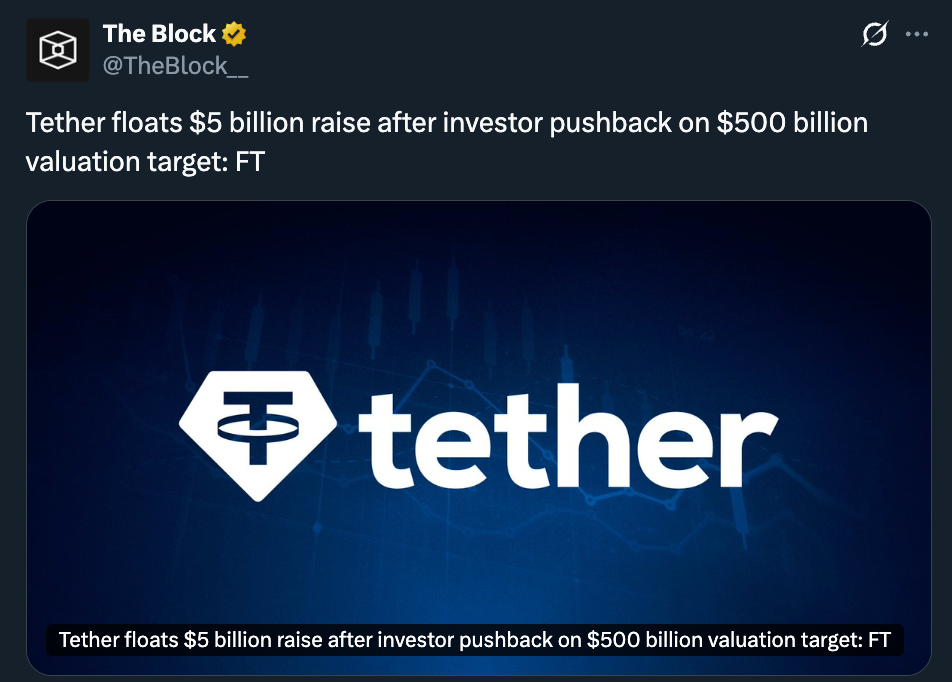 Tether’s brief flirtation with a $500 billion valuation always felt more like narrative theater than a serious exercise in capital allocation. Testing a minority raise at that level was bound to collide with investor reality, and it did. Scaling expectations down to a $5 billion raise is not a stumble, it’s an acknowledgment that even in crypto, numbers eventually have to make sense.