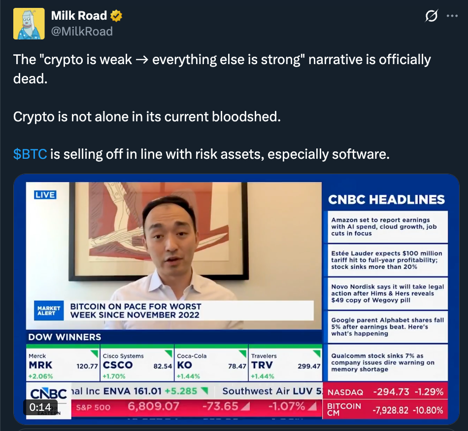 The “crypto is weak on its own” narrative is basically obsolete. Bitcoin’s drop makes more sense when viewed alongside the selloff in software stocks and broader equity stress. What looks like a crypto fault line often turns out to be a market-wide repricing that hits every volatile asset at the same time.