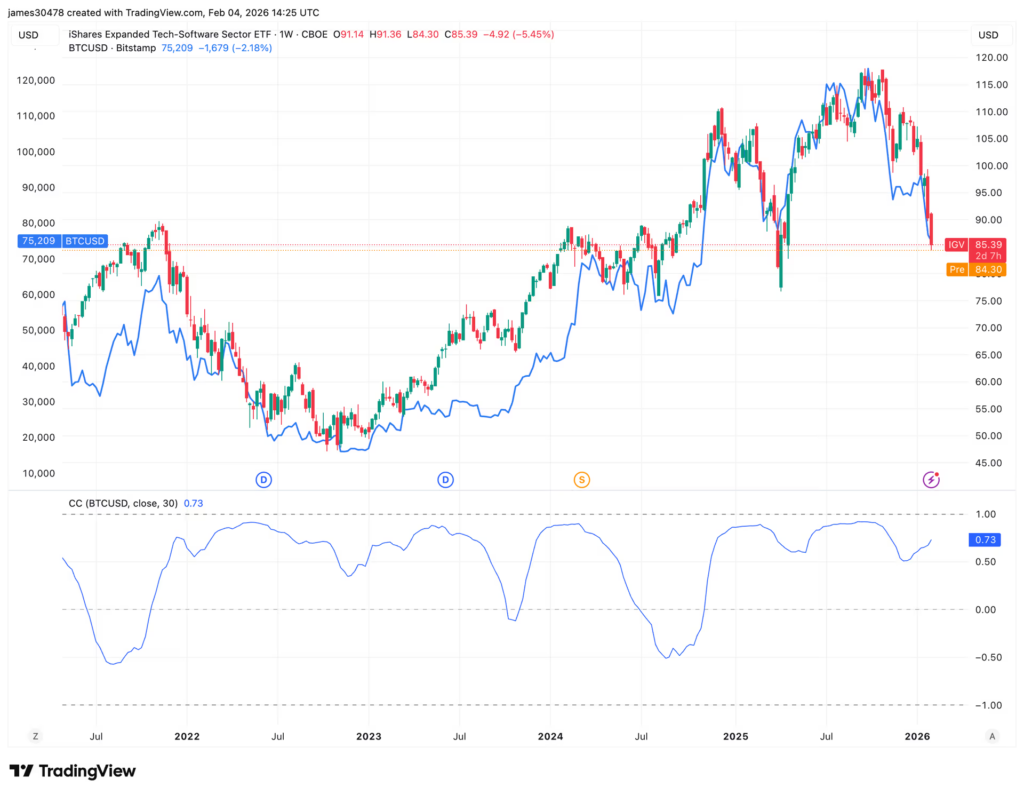 - Bitcoin moved in sync with equities and software stocks during the recent risk-off wave