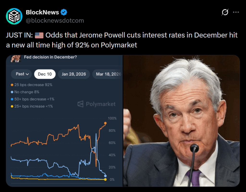 - QT has officially ended, and markets now price in 92% odds of a December rate cut.