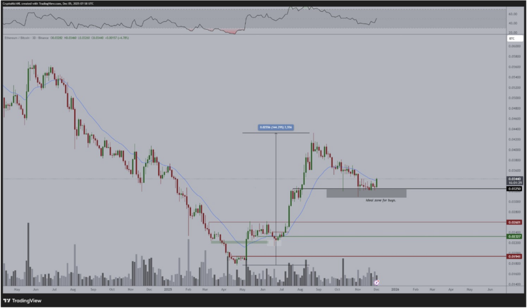 The ETH/BTC pair hovered around 0.03440 satoshis, sitting right above a major support region that’s held almost the entire year. The structure even looks like a potential double-bottom forming—price tapped the same range once earlier, then returned for a second hit without breaking down. That zone between roughly 0.026 and 0.034 satoshis has acted like a magnet all through 2024 and into 2025.