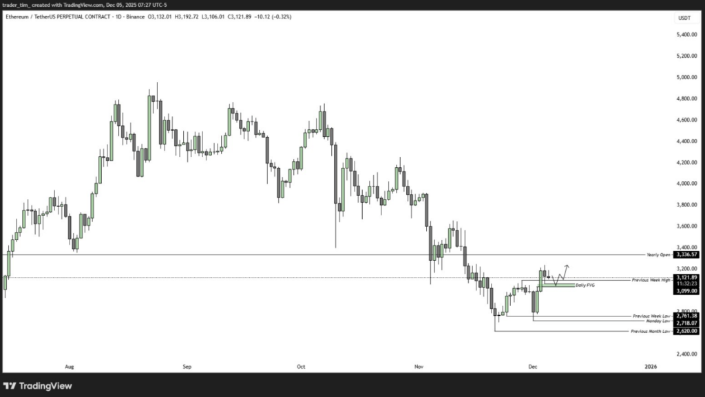 Tim admitted the setup feels “uncomfortable” because Bitcoin looks weak—but emphasized that ETH’s daily structure remains intact and the risk-reward is still better than most large-caps.