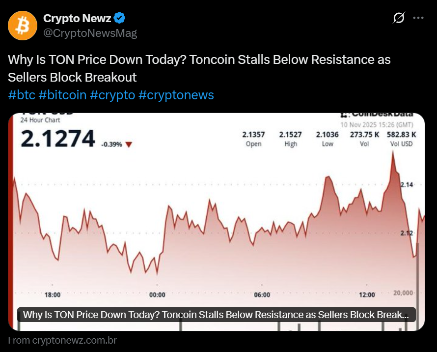 - Toncoin failed to hold above $2.14 and retreated to $2.127 after a rejection at key resistance.