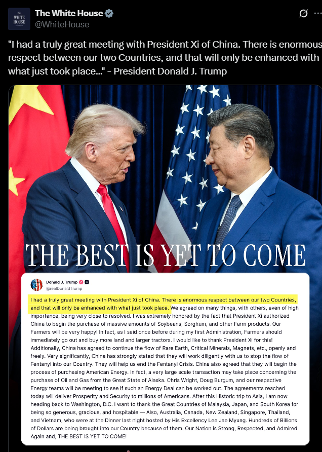 For now, markets appear cautiously optimistic. The easing of rare-earth restrictions and renewed soybean imports could help stabilize global supply chains, while ongoing dialogue between Washington and Beijing hints at the possibility of a new era of pragmatic cooperation after years of economic brinkmanship.