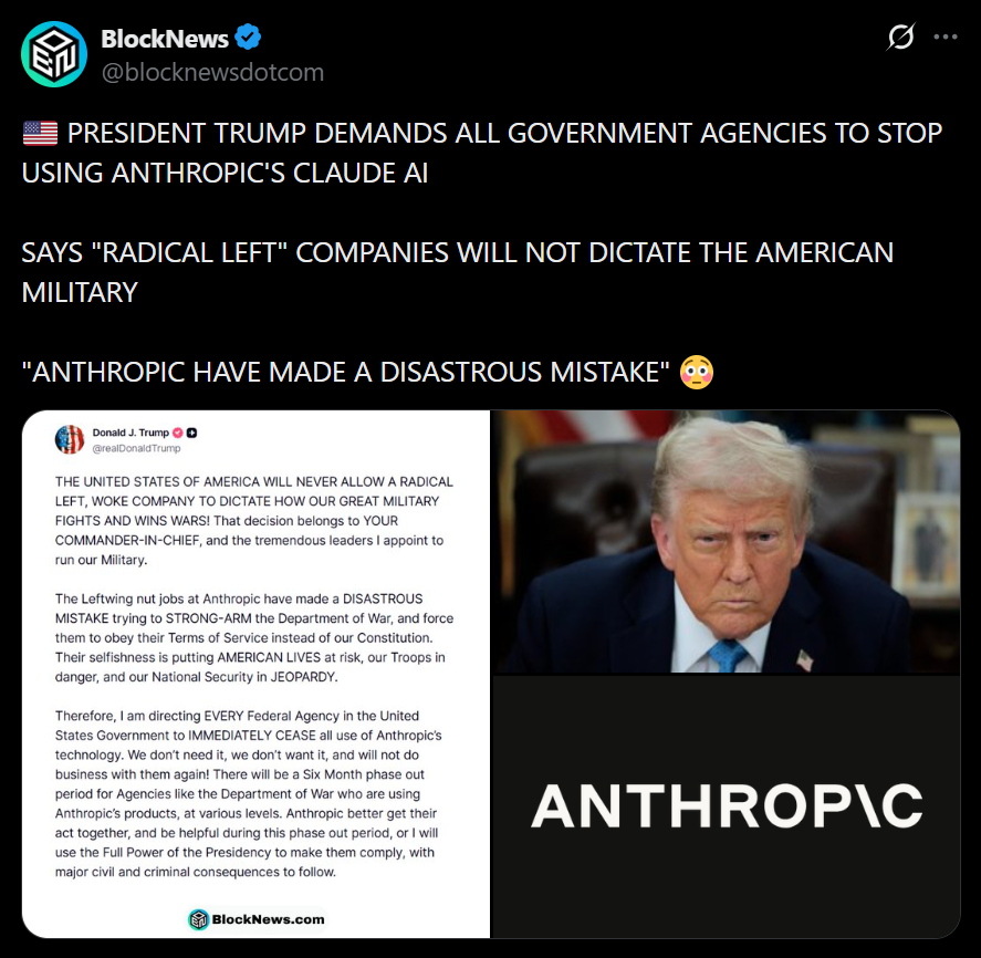 President Trump has directed all federal agencies to immediately stop using Anthropic’s technology, marking a sharp escalation in tensions between the White House and the AI company. Agencies currently relying on Anthropic products will have six months to phase them out, including the Department of War. The administration warned that failure to cooperate during the transition could lead to civil or even criminal consequences.