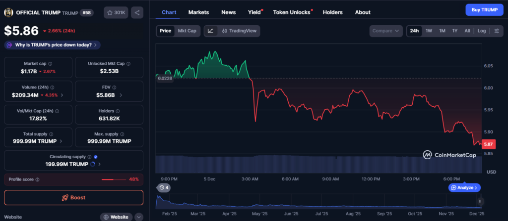 Trump Coin has been on a painful slide for months, dropping nearly 92 percent from its January all-time high near $73. The token once rode a wave of hype tied to President Trump’s inauguration and his early pro-crypto stance, but that momentum faded way faster than many expected. TRUMP is now sitting around the 93rd spot by market cap, with daily and weekly charts still flashing red. It’s been a rough stretch for holders watching the token bleed value day after day.