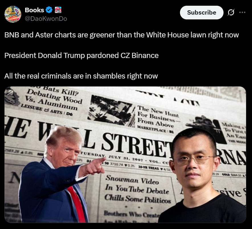- Trump reportedly pardons Binance founder CZ, according to WSJ.