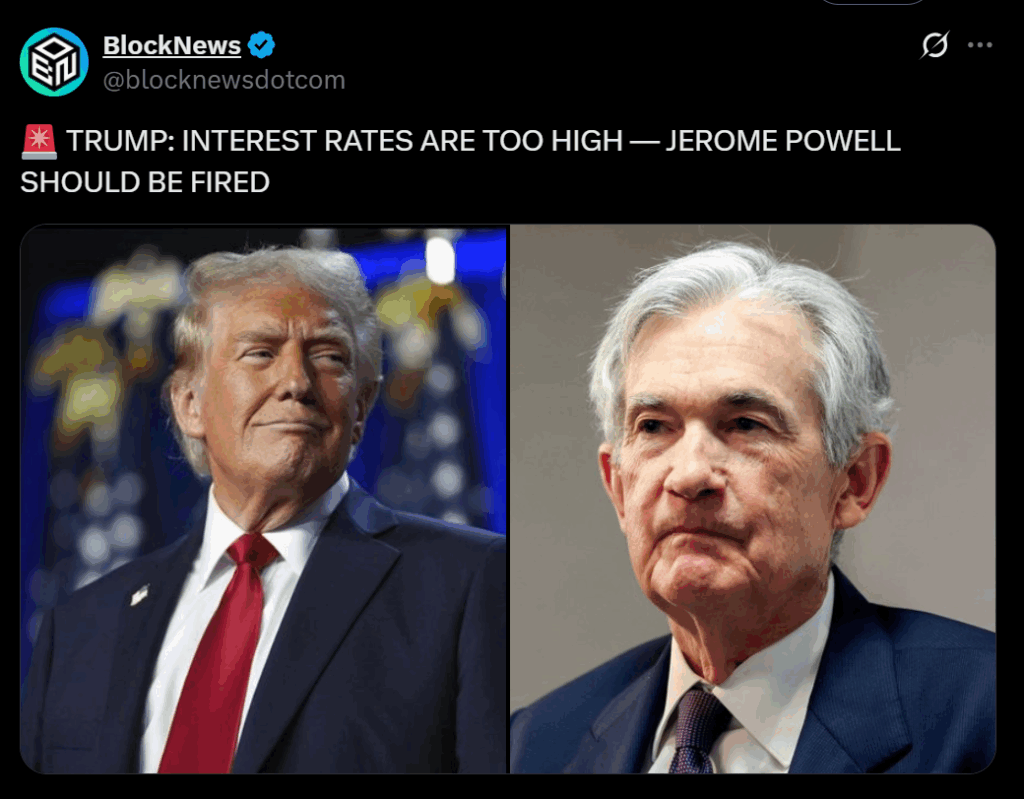 - Trump says he wants Powell removed “right now,” blaming policy disagreements.