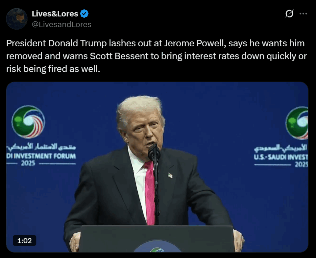 President Trump ignited a fresh wave of controversy on Tuesday after saying he would remove Federal Reserve Chair Jerome Powell “right now,” if not for people “holding [him] back.” The comments came ahead of a White House meeting with Saudi Crown Prince Mohammed bin Salman, where Trump sharply criticized Powell’s handling of interest rates. Calling the Fed Chair a “fool” and a “stupid man,” Trump made clear he prefers to see a leadership change sooner rather than later, even though Powell’s term does not expire until May.
