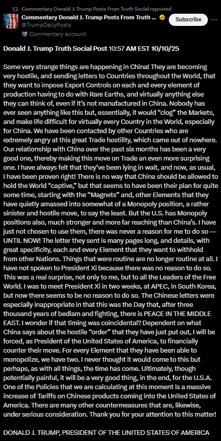 In a Truth Social post on Friday morning, Trump accused China of trying to “hold the world captive” through its control of rare earth resources, which are essential for technologies ranging from electric vehicles and defense systems to semiconductors. “One of the policies we are calculating at this moment is a massive increase of tariffs on Chinese products,” Trump wrote, adding that “many other countermeasures” were also under consideration.