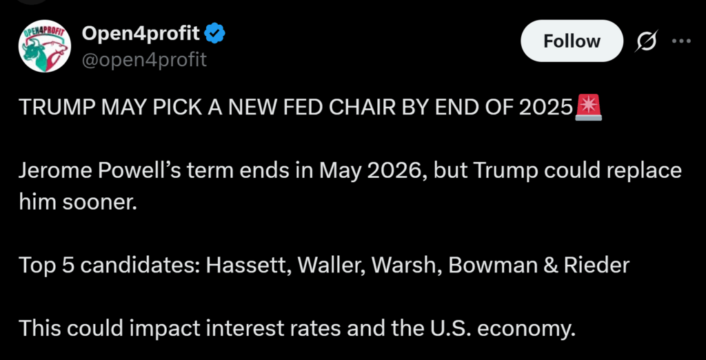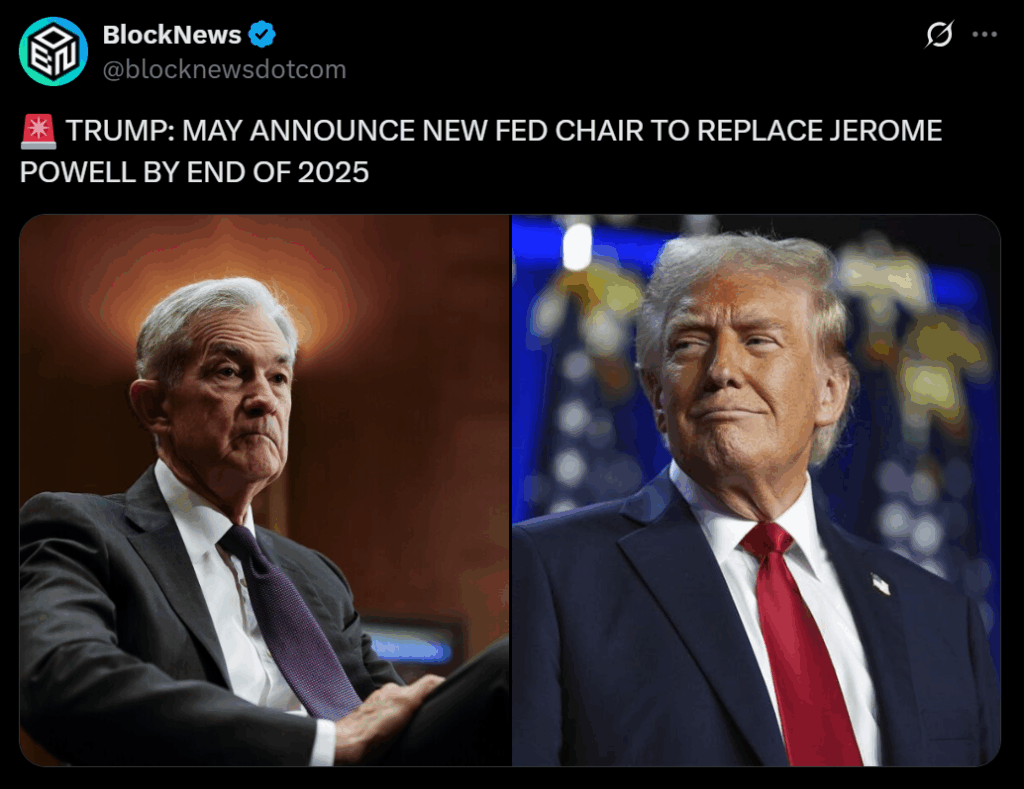 • President Trump says he may name a new Fed Chair before year-end, replacing Jerome Powell.