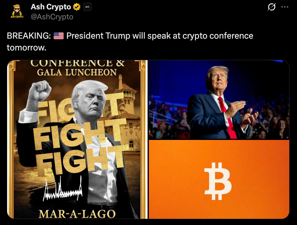 - Trump to speak at crypto event limited to top $TRUMP coin holders