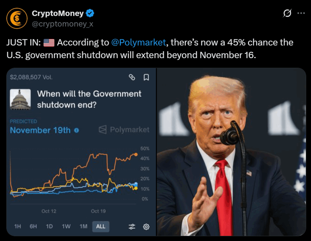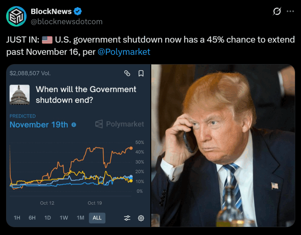 - Prediction markets show 40–45% odds of the shutdown lasting beyond Nov. 16.