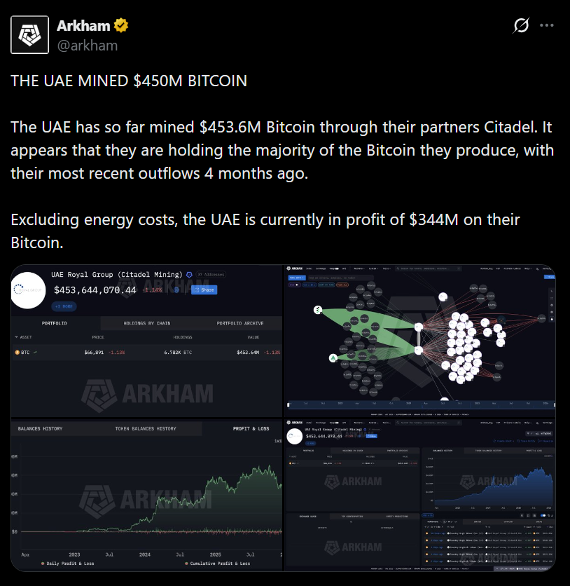 The UAE’s Bitcoin mining sector is getting fresh global attention after Arkham published a major update claiming the country has mined around $453.6 million worth of Bitcoin through its partner, Citadel. According to the dataset, most of that mined BTC is still being held, with the last major outflow reportedly occurring about four months ago.