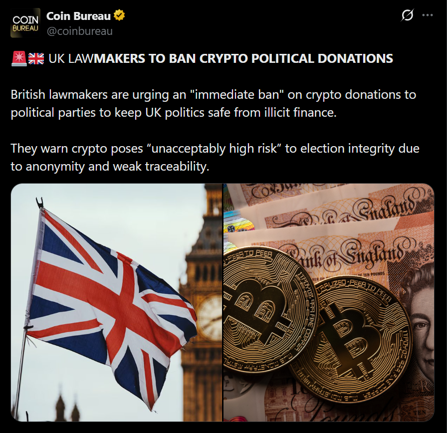 UK lawmakers are pushing for an immediate ban on crypto donations in politics, citing concerns over anonymity and potential foreign influence. On the surface, the argument is straightforward. Crypto transactions can make it harder to verify where funds originate, raising questions about election integrity and compliance.
