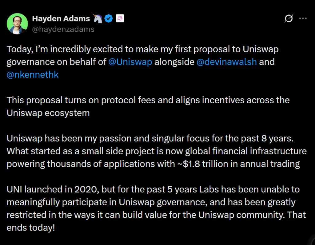 The main catalyst behind this latest move comes straight from Uniswap’s founder and CEO, Hayden Adams. In his first-ever proposal to Uniswap governance, announced on X, Adams laid out a set of changes designed to tighten UNI’s token economics and push more value back into the protocol.