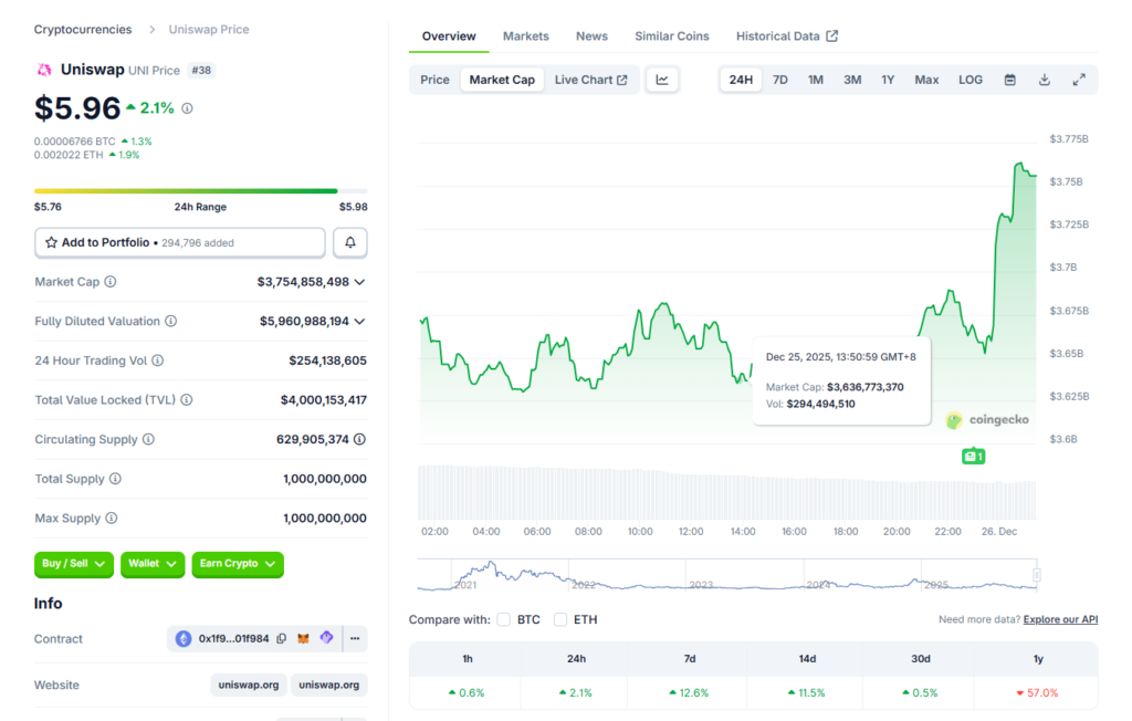 Uniswap’s UNI token is showing mild strength as the community votes on the high-impact “UNIfication” governance proposal. The vote opened on December 20 and is set to close in less than 20 hours, with early results already signaling overwhelming support. UNI briefly jumped from around $5.4 to $6.4 shortly after voting began before pulling back alongside the broader market, and is now trading near $6, up roughly 1.5% over the past 24 hours, according to CoinGecko data.
