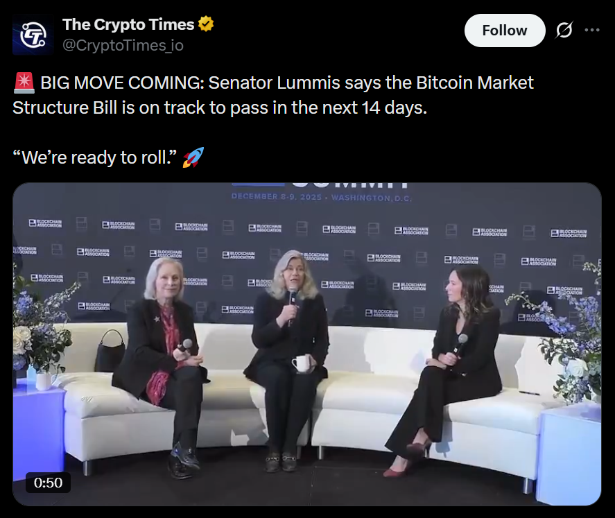 - Senator Lummis plans a December markup for the long-delayed crypto market structure bill.