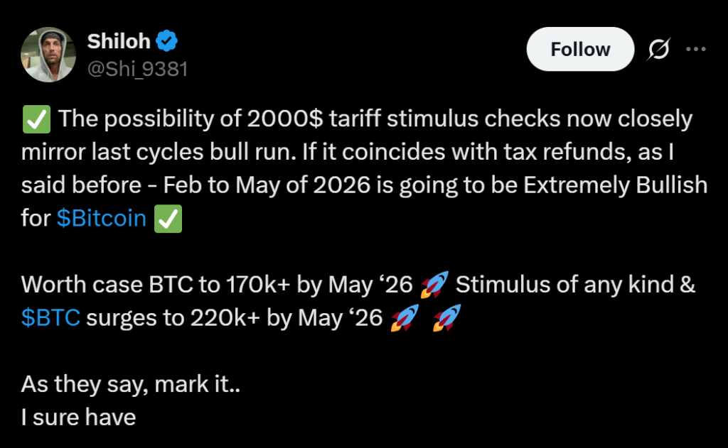 - Bitcoiners are comparing the potential $1,000–$2,000 refund wave to 2020’s stimulus checks, which coincided with Bitcoin’s explosive run from around $10,000 to over $60,000.