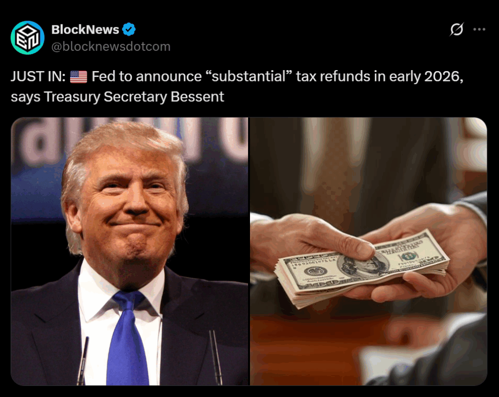 - While details and IRS guidance are still missing, the combined narrative of tax refunds, tariff rebates, and a resolved shutdown is already energizing crypto sentiment and could act like a stealth stimulus if it all lands at once.