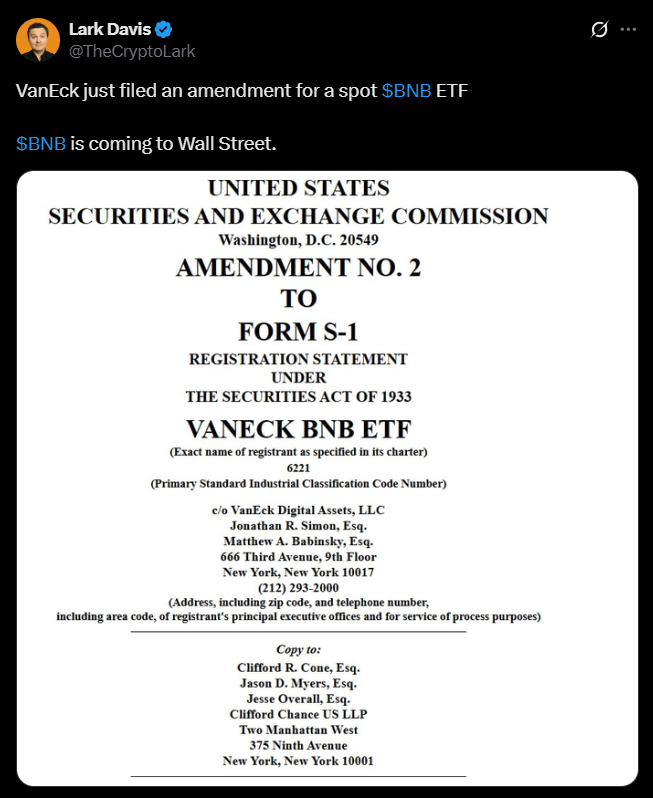 The decision lands at an awkward moment for BNB, a token that keeps drifting in and out of the SEC’s line of fire. While Solana staking has already found its way into U.S. ETF wrappers, BNB’s legal risk appears serious enough that VanEck is choosing caution over potential yield. For investors, that means the ETF will track price only, with no extra staking income on top.