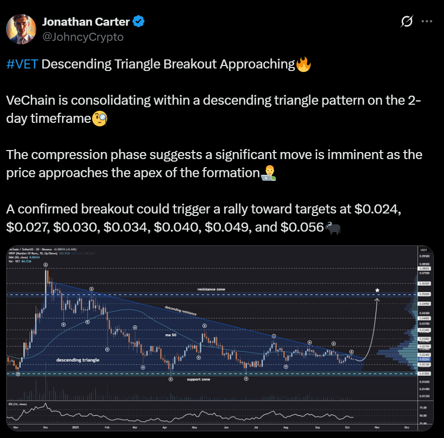 Some analysts expect the coming weeks to bring relief. The Federal Reserve is anticipated to roll out another interest rate cut, which could spark renewed inflows into risk assets like crypto. If that happens, VeChain may reclaim its December 2024 price levels, supported by a broader market rebound.