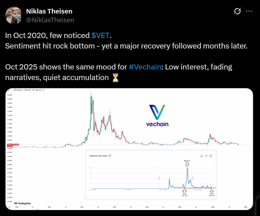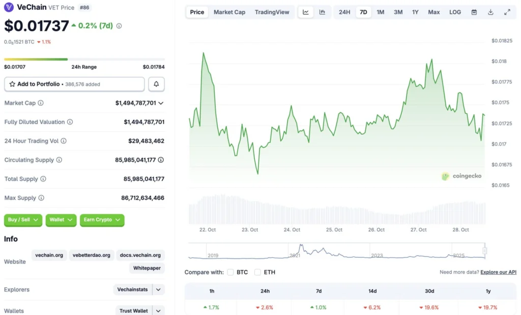 VeChain (VET) has been under pressure amid the ongoing market correction, dropping 2.6% in 24 hours and nearly 20% over the past month, according to CoinGecko. The token now trades near $0.01, marking a 93% fall from its all-time high of $0.281 set in April 2021. Despite the steep decline, VET did manage a modest 1% weekly gain, hinting that accumulation may be quietly taking place among long-term investors.