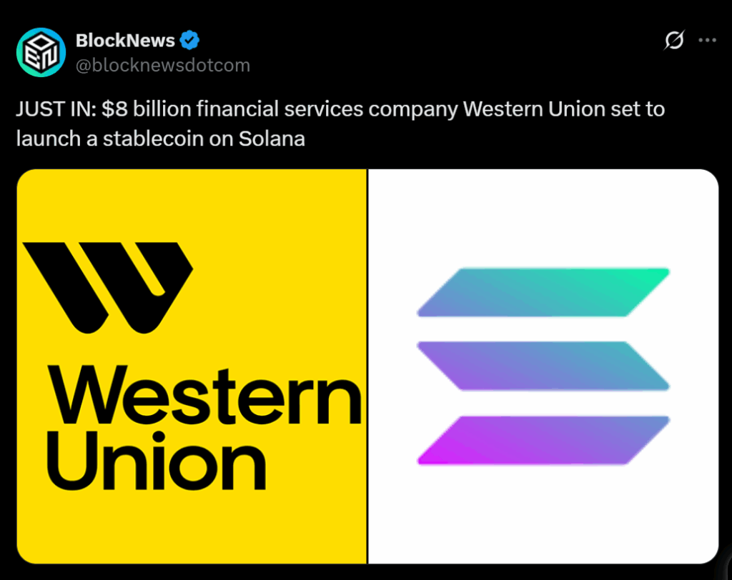 Western Union is officially entering the crypto payments arena with plans to launch a U.S.-dollar stablecoin on the Solana blockchain, according to a report from The Wall Street Journal. The initiative aims to modernize cross-border money transfers by leveraging blockchain’s efficiency and Solana’s lightning-fast transaction speeds. The stablecoin will power Western Union’s retail remittance network, reducing settlement costs while improving transaction speed and transparency.