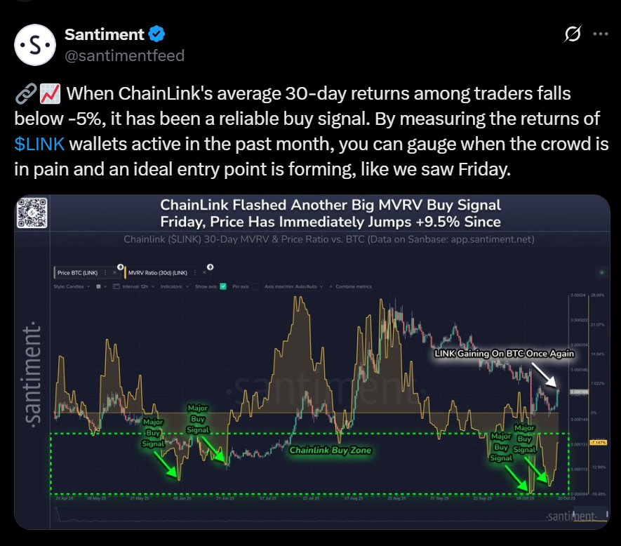 The Market Value to Realized Value (MVRV) ratio — a key sentiment metric — triggered a major buy signal as most short-term holders are currently at a loss. This environment has often marked the beginning of recovery phases. Following the signal, LINK’s price jumped 9.5% intraday, hinting that whales were actively accumulating.