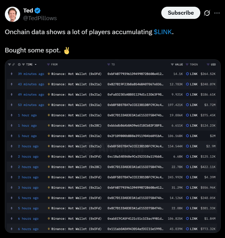Recent Santiment data revealed that whales have been withdrawing millions of dollars worth of LINK from exchanges. Binance hot wallets alone processed over 440,000 LINK worth nearly $8 million, suggesting long-term positioning rather than short-term speculation.