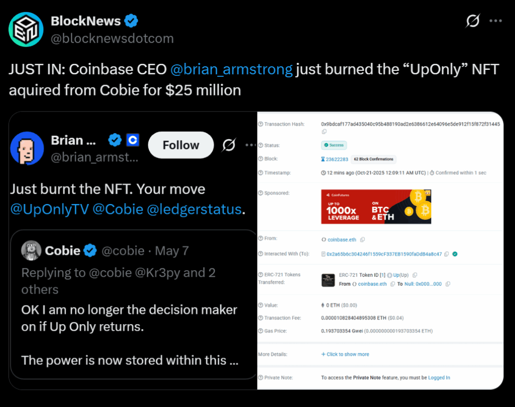 Culture bomb: Coinbase purchased the UpOnly NFT from Cobie (Jordan Fish) for $25,000,000 in USDC—a token whose metadata includes a burn clause compelling production of a new UpOnlyTV season. On-chain trackers flagged the 25M USDC transfer from a Coinbase-linked wallet, and Brian Armstrong amplified the news, signaling the show’s comeback after a multi-year pause. The deal instantly dominated crypto Twitter and pushed “UpOnly” to the top of social mentions.