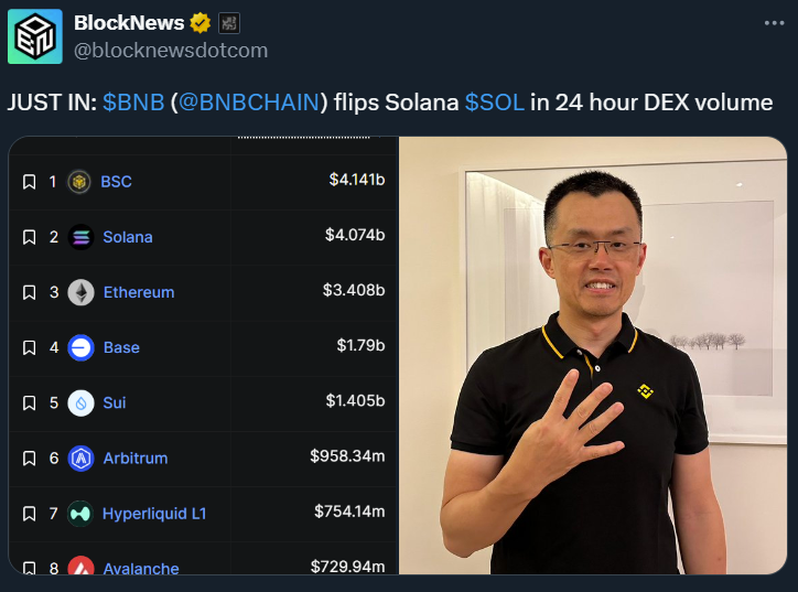 • BNB Chain flipped Solana in DEX volume, hitting $178B vs. $143B.