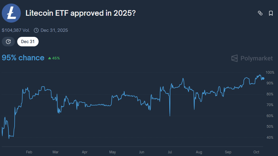 Momentum around altcoin-based ETFs accelerated as Canary Capital filed final amendments for Litecoin and Hedera spot funds. This marks the final step before SEC review, signaling that approval could arrive within weeks. Polymarket data shows a 95% probability of greenlighting by year-end, sparking optimism across mid-cap crypto sectors. Both assets are now showing stronger liquidity and renewed retail engagement ahead of the decision window.