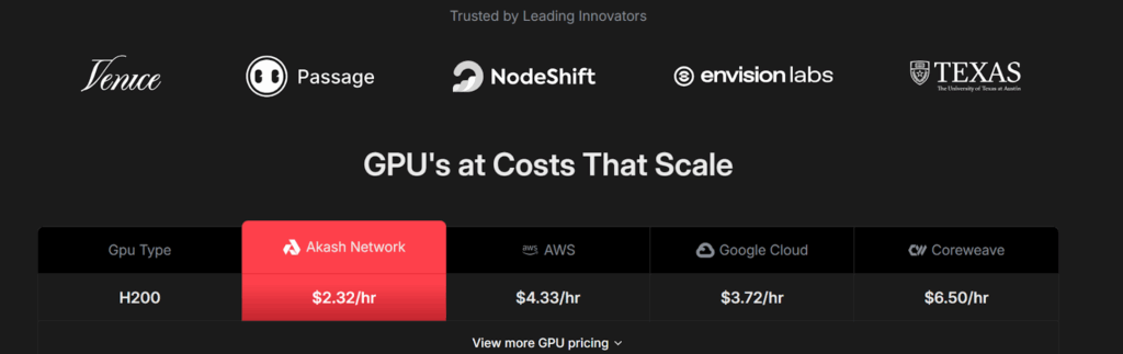 - AI Accessibility – High-performance GPUs are often monopolized by hyperscalers, making AI development expensive and exclusive. Akash’s GPU marketplace opens access to Nvidia H100 and A100 units, empowering developers to train and deploy models affordably.
