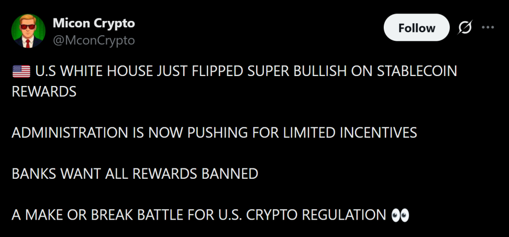 The White House says it is closing in on resolving one of the biggest sticking points in U.S. crypto market structure legislation: whether crypto firms can offer rewards tied to stablecoins. Speaking at ETHDenver, White House Crypto Council Executive Director Patrick Witt said the gap between banks and crypto firms has “shrunk considerably” following a recent closed-door meeting.