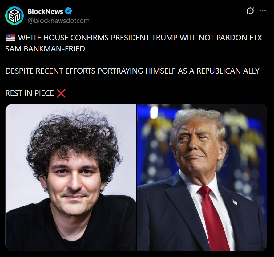 • The White House confirms Trump does not plan to pardon Sam Bankman-Fried