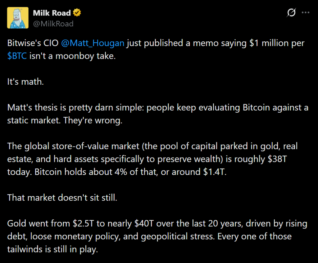 Bitwise CIO Matt Hougan says the argument for a $1 million Bitcoin price is less about hype and more about simple market math. In a recent memo, Hougan explained that many critics evaluate Bitcoin as if it competes within a fixed pool of capital. In reality, he argues, Bitcoin is part of a much larger and expanding global store-of-value market.