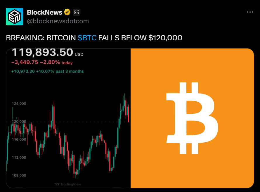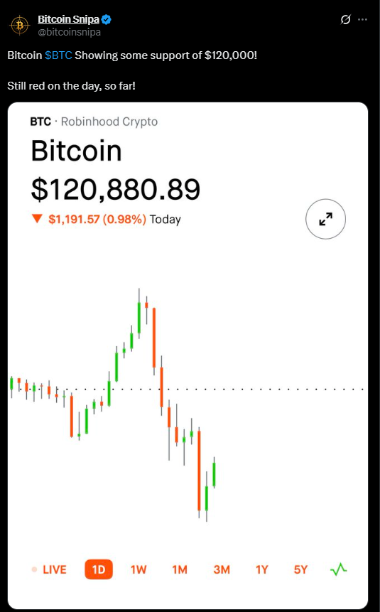 Bitcoin briefly dropped to the $120,000 level, triggering over $120 million in liquidations across the crypto market in just one hour. The move came after BTC’s latest run to new all-time highs above $126,000 earlier this week, leaving overleveraged traders exposed to a quick reset.