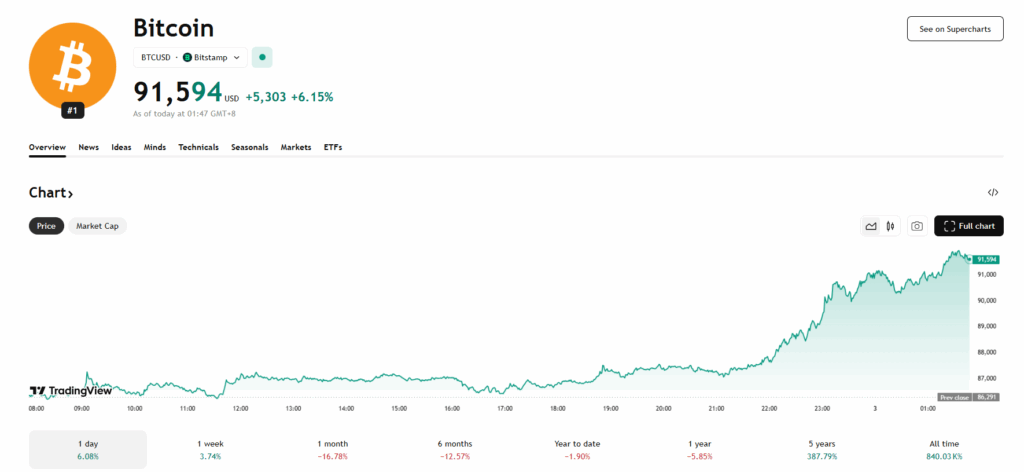 Crypto did not creep higher today — it exploded. More than $300 billion flooded back into digital assets in a single session as investors rushed into risk-on mode. Bitcoin blasted above $91,000, Ethereum reclaimed the $3,000 level, and large caps across the board delivered clean 8%–15% intraday gains. The mood flipped in a matter of hours, not days, and the spark wasn’t subtle.