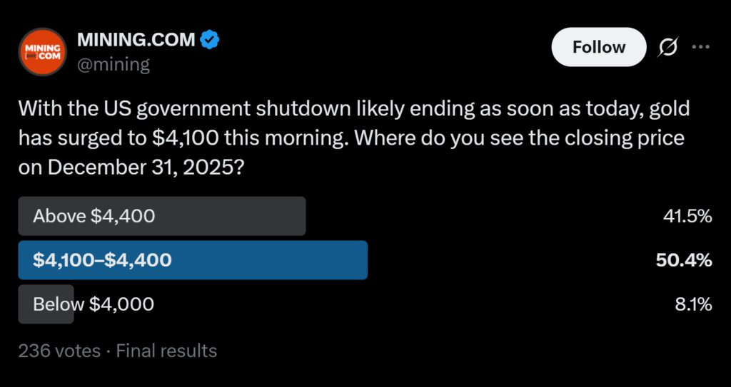 As one veteran metals trader put it, recent price action suggests that even a small hiccup in the shutdown vote — a delay or messy politics — could cause both stocks and precious metals to wobble short-term. But for now, the market is leaning toward “shutdown ending + data clarity,” which keeps gold well-supported.