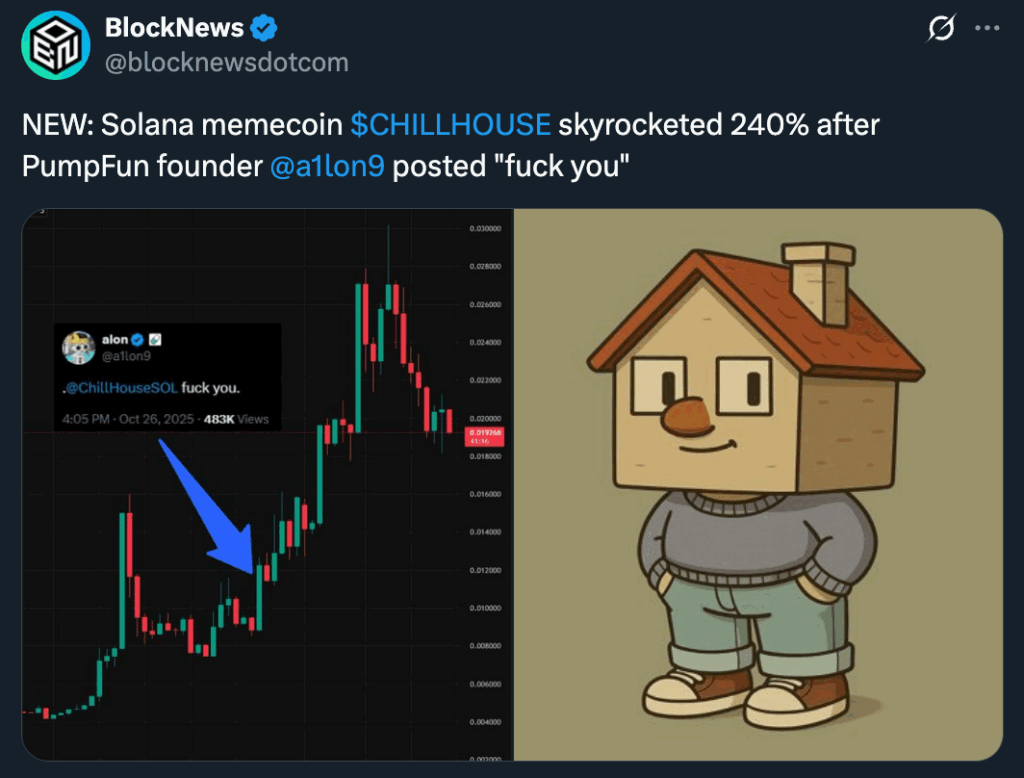 Solana’s meme market erupted overnight as $CHILLHOUSE surged more than 240% after PumpFun founder Alon (@a1lon9) posted a blunt, two-word message — “fuck you” — on X. The post quickly went viral, sparking a frenzy of speculation and turning the obscure token into the day’s most talked-about trade. Within hours, liquidity flooded in as traders rushed to join the hype, transforming a casual outburst into a multimillion-dollar market event.