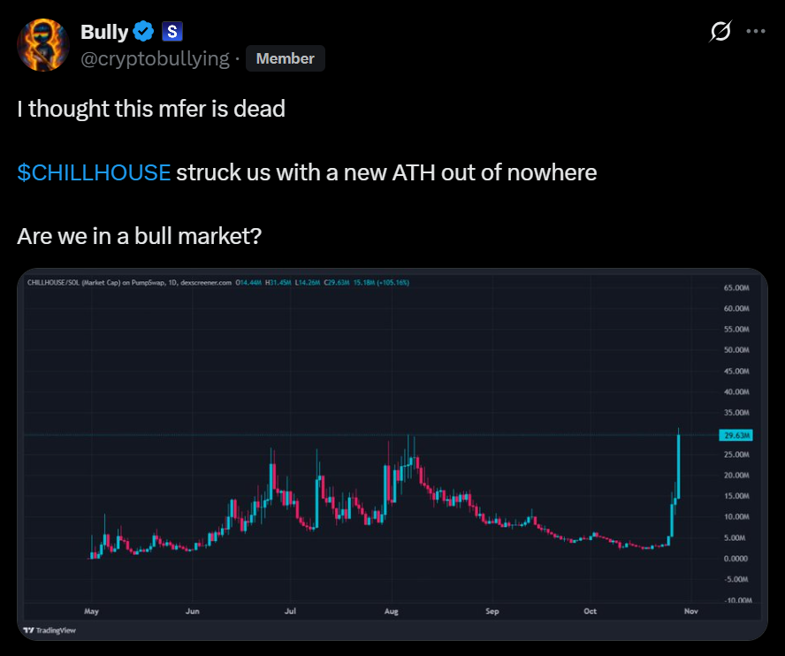 - $CHILLHOUSE surged 240% after PumpFun’s Alon posted a viral “fuck you” on X.