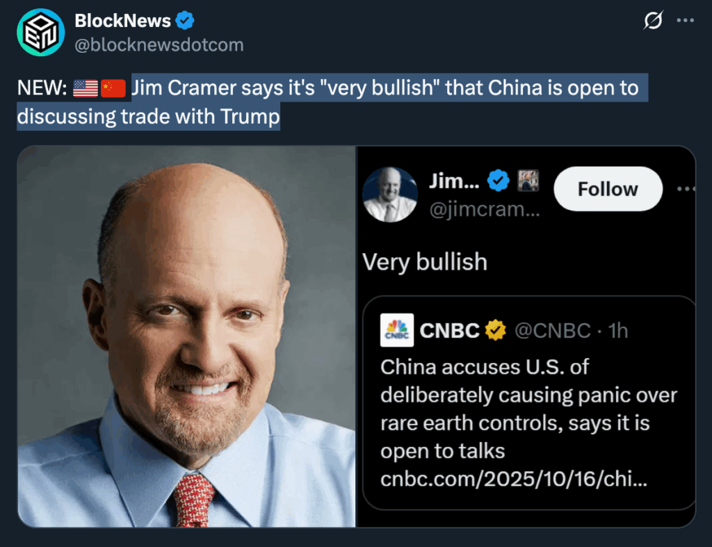 Cramer’s call that China’s openness to trade talks is “very bullish” reflects a positive shift in market sentiment. But it’s not a guarantee of full resolution…just a potentially helpful pause in escalation.