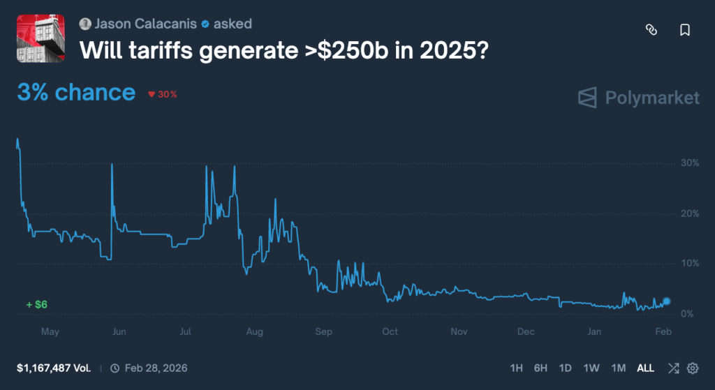 Markets do not pile into seven-figure wagers for entertainment. The surge in Polymarket activity around U.S. tariff revenue exceeding $250 billion is a loud signal that fear, not optimism, is shaping expectations for 2025. This is not about fine-tuning economic forecasts. It is a collective expression that policy volatility itself has become the dominant macro variable. Traders are betting that geopolitical pressure will reshape capital flows in ways traditional models struggle to capture.