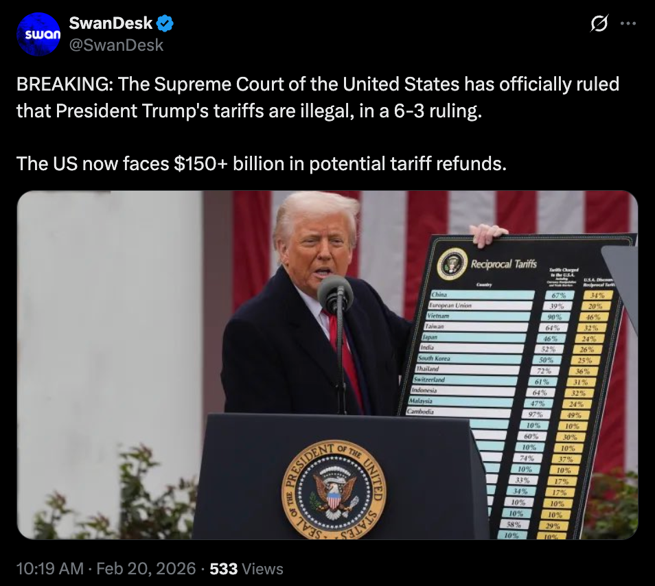 Late Friday, the U.S. Supreme Court delivered a decision that quietly rewired the macro backdrop. In a 6–3 ruling, the court found that former President Trump overstepped his authority by imposing broad tariffs under emergency powers that were never meant for that purpose. Both conservative and liberal justices agreed that trade policy of this scale belongs to Congress, not the executive branch.
