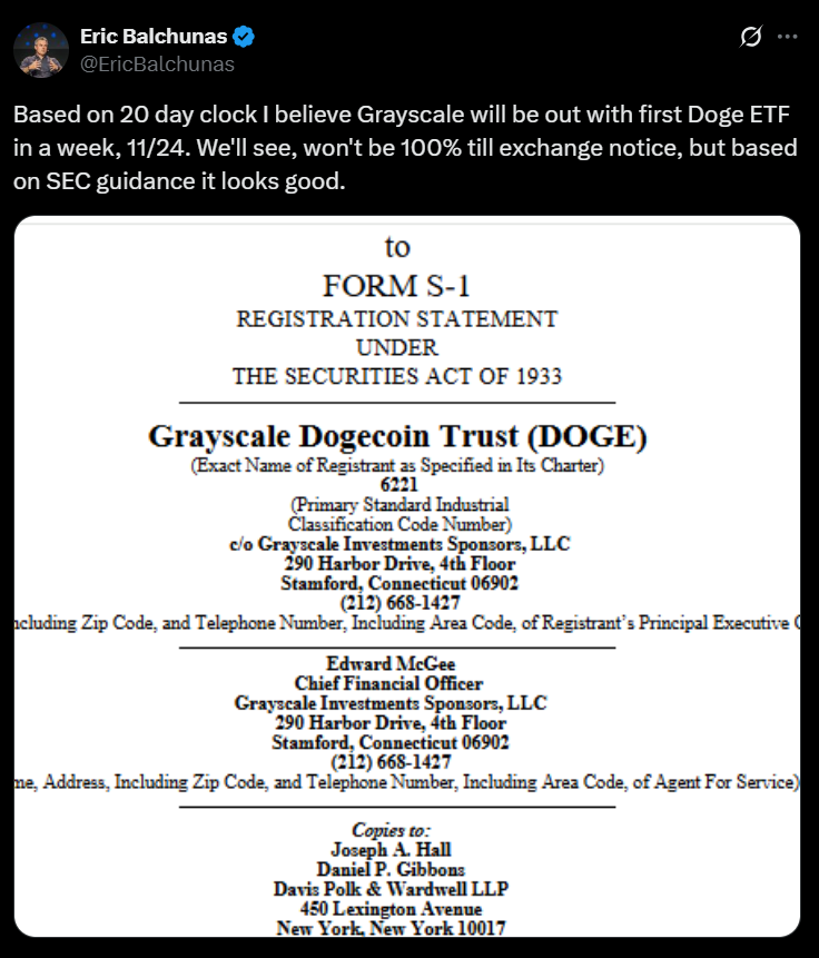 According to Bloomberg ETF analyst Eric Balchunas, Grayscale’s proposed Dogecoin ETF could hit the market as early as Nov. 24, 2025. He’s not “100%” certain, but says that based on current SEC signals, the odds look pretty good. If this thing goes live, it would become the first memecoin ETF in the U.S. — a pretty wild milestone for a coin that started as a joke. The big question, though, is simple: does an ETF actually help DOGE moon again, or is this just another headline in a rough market?